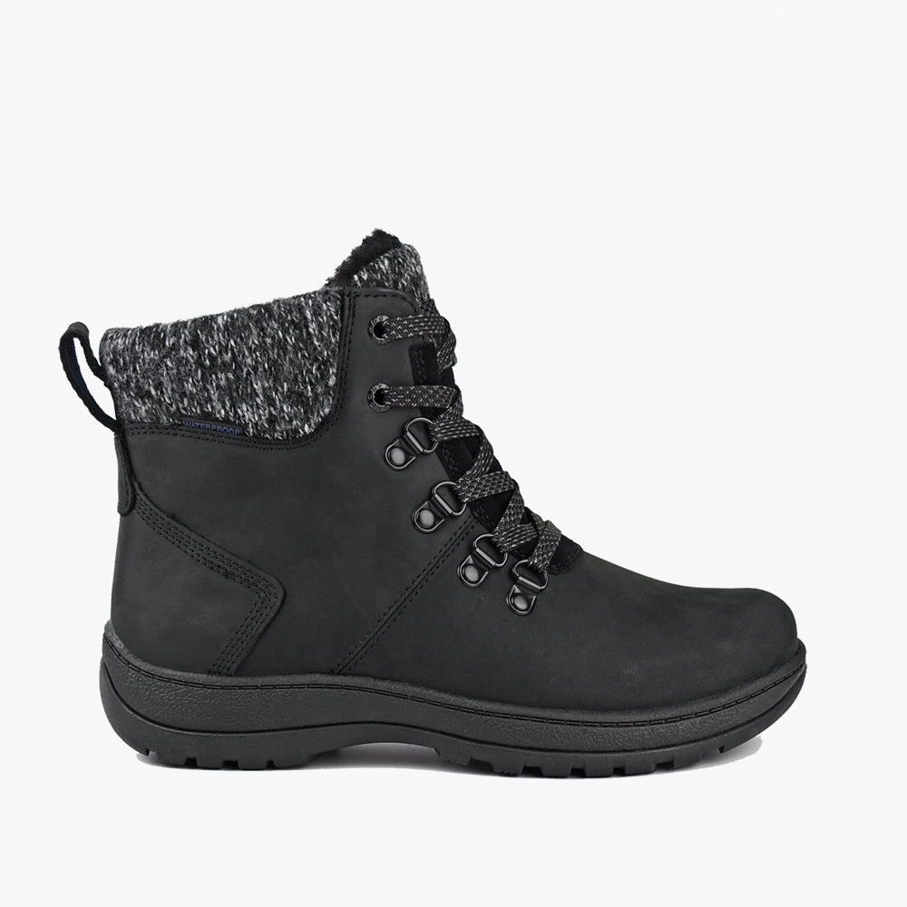 These trendy looking, ankle height waterproof winter boots are super comfortable! They have a thermal memory foam insole that helps keep your feet warm. They have a wool blend lining inside. They tie up with laces, which are long so no problem with lacing them up. There is also a zip on the inside of the boot which helps with putting the boot on. Very nice looking, comfortable ankle boot for fall or winter wear. Highly recommend.
